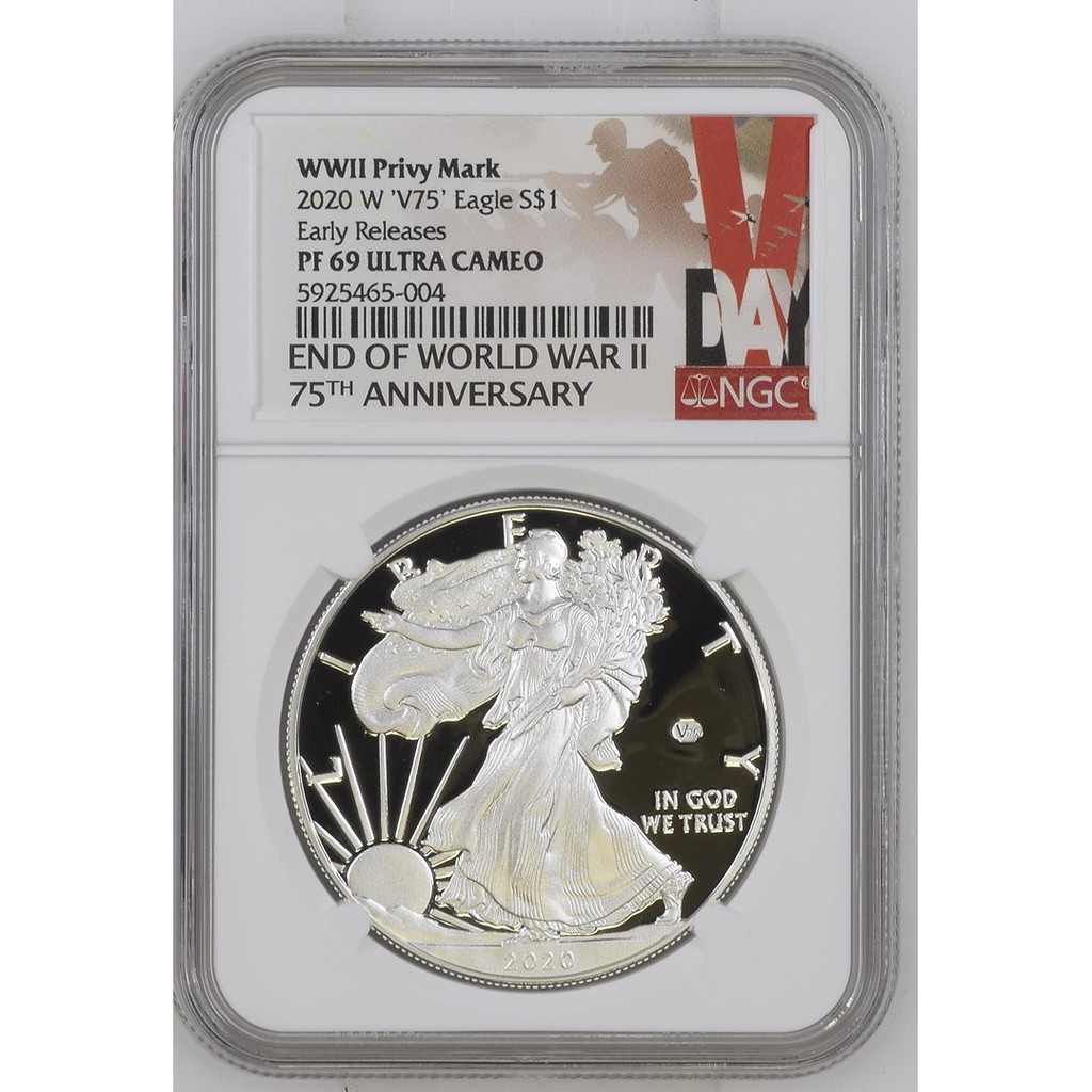 2020 w end of world war 2 75th ww2 v75 american silver eagle privy pcgs pr69 20xf. A symbolic v75 privy mark is stamped on the obverse of this american eagle silver proof coin. Graded by pcgs with first strike. The silver eagle coin company is pleased to offer american eagle silver dollars and world silver dollars at competitive prices! The silver eagle coin company is pleased to offer american eagle silver dollar coins directly to public at discount prices. A symbolic v75 privy mark is stamped on the obverse of this american eagle silver proof coin. Each tube of mintcertified™ silver eagles has 20 coins in mint the reverse of the american silver eagle for the first half of 2021 features the iconic heraldic eagle design which is a bald eagle. The silver proof has a limited mintage of 75,000 pieces and will be struck from 1 oz of.999 fine silver. This limited coin was tough to grab but now the question is: The proof silver eagles have been minted at the lady liberty graces the obverse of every american silver eagle and rightfully so! Comment down below if you have. Since this is the last silver eagle with the reverse design, it is likely that this coin will sell out rather quickly. This limited mintage proof american silver eagle was released to commemorate the end of world war ii.
